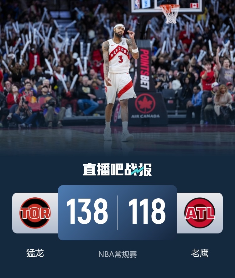 首节对决双方手感非常不错交替拿分且单节均砍下34+得分,猛龙率先发力一度拿到10分领先,但老鹰最后时刻连续飚进4记三分追至2分;次节猛龙以一波6-0开局稍稍拉开优势逐渐控制局势,节中一度拉开到12分,不过老鹰及时回暖止住颓势并追至6分进入下半场。休息归来双方比拼进攻都无法阻止对手,不过后半段老鹰熄火直接导致崩盘,猛龙抓住机会送上一波18-2的攻势直接拉开23分的优势,这一节猛龙狂轰45分。末节猛龙牢守大比分领先没有给对手任何机会,最终,猛龙客场大胜老鹰迎来开门红。