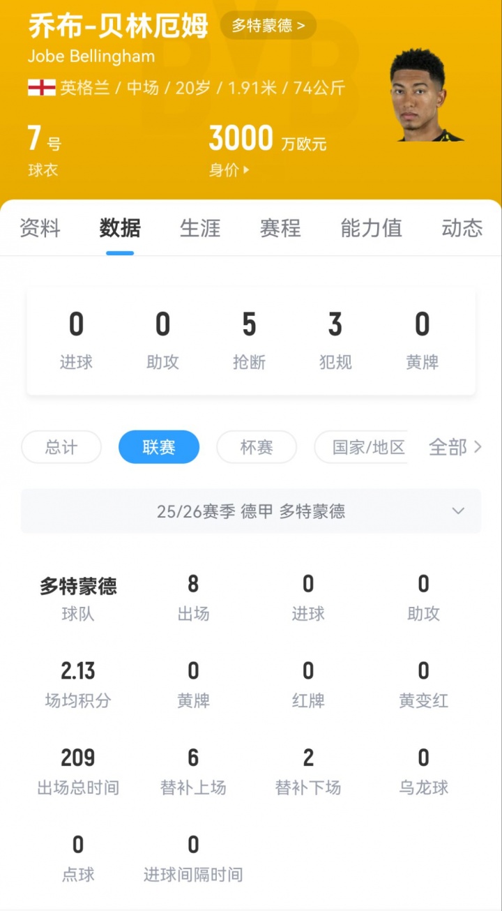 20岁的贝林厄姆本赛季已经为多特在德甲出战8场比赛,没有联赛进球或助攻,仅在上场欧冠对阵哥本哈根的比赛中贡献2次助攻。目前他的德转身价为3000万欧元。